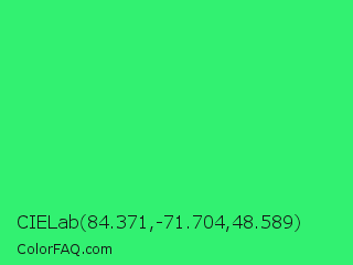 CIELab 84.371,-71.704,48.589 Color is a normal green color and the nearest color is UFO Green #3cd070. Hex code #32f171 and RGB value is rgb(50,241,113). In RGB color space, this color is composed of 20% red, 95% green, 44% blue, In CMYK color space, this color is composed of 79% cyan, 0% magenta, 53% yellow , 5% black , In HSL color space, this color has a hue angle of 140° , 87% saturation and 57% lightness.