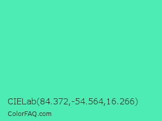 CIELab 84.372,-54.564,16.266 Color is a light green color and the nearest color is Eucalyptus #44d7a8. Hex code #4decb2 and RGB value is rgb(77,236,178). In RGB color space, this color is composed of 30% red, 93% green, 70% blue, In CMYK color space, this color is composed of 67% cyan, 0% magenta, 25% yellow , 7% black , In HSL color space, this color has a hue angle of 158° , 81% saturation and 61% lightness.