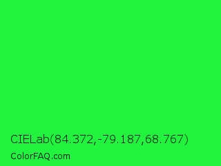 CIELab 84.372,-79.187,68.767 Color is a normal green color and the nearest color is Malachite #0bda51. Hex code #21f33f and RGB value is rgb(33,243,63). In RGB color space, this color is composed of 13% red, 95% green, 25% blue, In CMYK color space, this color is composed of 86% cyan, 0% magenta, 74% yellow , 5% black , In HSL color space, this color has a hue angle of 129° , 90% saturation and 54% lightness.