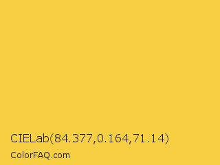 CIELab 84.377,0.164,71.14 Color is a light yellow color and the nearest color is Bright Sun #fed33c. Hex code #f7cf42 and RGB value is rgb(247,207,66). In RGB color space, this color is composed of 97% red, 81% green, 26% blue, In CMYK color space, this color is composed of 0% cyan, 16% magenta, 73% yellow , 3% black , In HSL color space, this color has a hue angle of 47° , 92% saturation and 61% lightness.