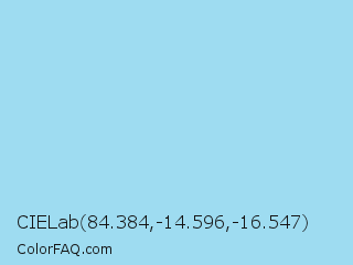 CIELab 84.384,-14.596,-16.547 Color is a light blue color and the nearest color is Non Photo Blue #a4dded. Hex code #9edcf1 and RGB value is rgb(158,220,241). In RGB color space, this color is composed of 62% red, 86% green, 95% blue, In CMYK color space, this color is composed of 34% cyan, 9% magenta, 0% yellow , 5% black , In HSL color space, this color has a hue angle of 195° , 75% saturation and 78% lightness.