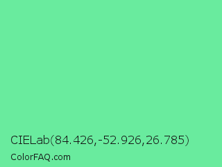CIELab 84.426,-52.926,26.785 Color is a light green color and the nearest color is Medium Aquamarine #66ddaa. Hex code #69eb9e and RGB value is rgb(105,235,158). In RGB color space, this color is composed of 41% red, 92% green, 62% blue, In CMYK color space, this color is composed of 55% cyan, 0% magenta, 33% yellow , 8% black , In HSL color space, this color has a hue angle of 144° , 76% saturation and 67% lightness.