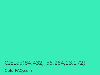 CIELab 84.432,-56.264,13.172 Color is a normal green color and the nearest color is Turquoise #40e0d0. Hex code #39edb8 and RGB value is rgb(57,237,184). In RGB color space, this color is composed of 22% red, 93% green, 72% blue, In CMYK color space, this color is composed of 76% cyan, 0% magenta, 22% yellow , 7% black , In HSL color space, this color has a hue angle of 162° , 83% saturation and 58% lightness.
