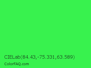 CIELab 84.43,-75.331,63.589 Color is a normal green color and the nearest color is Lime Green #32cd32. Hex code #38f24e and RGB value is rgb(56,242,78). In RGB color space, this color is composed of 22% red, 95% green, 31% blue, In CMYK color space, this color is composed of 77% cyan, 0% magenta, 68% yellow , 5% black , In HSL color space, this color has a hue angle of 127° , 88% saturation and 58% lightness.