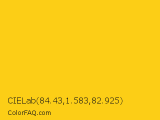 CIELab 84.43,1.583,82.925 Color is a normal yellow color and the nearest color is Jonquil #f4ca16. Hex code #fcce16 and RGB value is rgb(252,206,22). In RGB color space, this color is composed of 99% red, 81% green, 9% blue, In CMYK color space, this color is composed of 0% cyan, 18% magenta, 91% yellow , 1% black , In HSL color space, this color has a hue angle of 48° , 97% saturation and 54% lightness.