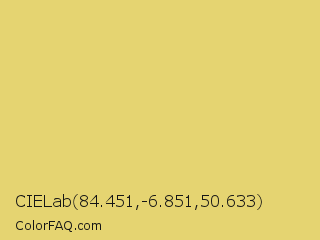 CIELab 84.451,-6.851,50.633 Color is a light yellow color and the nearest color is Straw #e4d96f. Hex code #e5d471 and RGB value is rgb(229,212,113). In RGB color space, this color is composed of 90% red, 83% green, 44% blue, In CMYK color space, this color is composed of 0% cyan, 7% magenta, 51% yellow , 10% black , In HSL color space, this color has a hue angle of 51° , 69% saturation and 67% lightness.