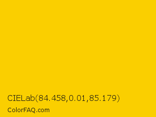 CIELab 84.458,0.01,85.179 Color is a normal yellow color and the nearest color is Tangerine Yellow #ffcc00. Hex code #facf00 and RGB value is rgb(250,207,0). In RGB color space, this color is composed of 98% red, 81% green, 0% blue, In CMYK color space, this color is composed of 0% cyan, 17% magenta, 100% yellow , 2% black , In HSL color space, this color has a hue angle of 50° , 100% saturation and 49% lightness.