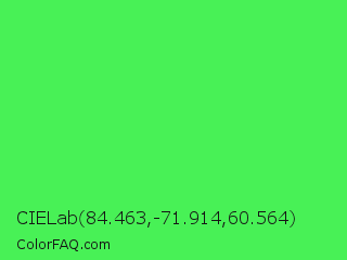 CIELab 84.463,-71.914,60.564 Color is a light green color and the nearest color is Screamin Green #66ff66. Hex code #48f156 and RGB value is rgb(72,241,86). In RGB color space, this color is composed of 28% red, 95% green, 34% blue, In CMYK color space, this color is composed of 70% cyan, 0% magenta, 64% yellow , 5% black , In HSL color space, this color has a hue angle of 125° , 86% saturation and 61% lightness.