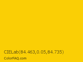 CIELab 84.463,0.05,84.735 Color is a normal yellow color and the nearest color is Tangerine Yellow #ffcc00. Hex code #facf05 and RGB value is rgb(250,207,5). In RGB color space, this color is composed of 98% red, 81% green, 2% blue, In CMYK color space, this color is composed of 0% cyan, 17% magenta, 98% yellow , 2% black , In HSL color space, this color has a hue angle of 49° , 96% saturation and 50% lightness.