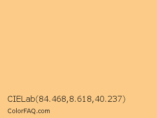 CIELab 84.468,8.618,40.237 Color is a light orange color and the nearest color is Chardonnay #ffcd8c. Hex code #fbcb87 and RGB value is rgb(251,203,135). In RGB color space, this color is composed of 98% red, 80% green, 53% blue, In CMYK color space, this color is composed of 0% cyan, 19% magenta, 46% yellow , 2% black , In HSL color space, this color has a hue angle of 35° , 94% saturation and 76% lightness.