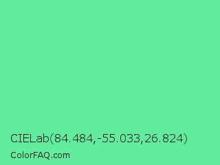 CIELab 84.484,-55.033,26.824 Color is a light green color and the nearest color is Medium Aquamarine #66ddaa. Hex code #61ec9e and RGB value is rgb(97,236,158). In RGB color space, this color is composed of 38% red, 93% green, 62% blue, In CMYK color space, this color is composed of 59% cyan, 0% magenta, 33% yellow , 7% black , In HSL color space, this color has a hue angle of 146° , 79% saturation and 65% lightness.