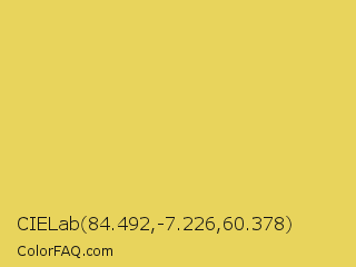 CIELab 84.492,-7.226,60.378 Color is a light yellow color and the nearest color is Confetti #e9d75a. Hex code #e8d45c and RGB value is rgb(232,212,92). In RGB color space, this color is composed of 91% red, 83% green, 36% blue, In CMYK color space, this color is composed of 0% cyan, 9% magenta, 60% yellow , 9% black , In HSL color space, this color has a hue angle of 51° , 75% saturation and 64% lightness.