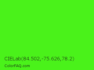 CIELab 84.502,-75.626,78.2 Color is a normal green color and the nearest color is Neon Green #39ff14. Hex code #4af21a and RGB value is rgb(74,242,26). In RGB color space, this color is composed of 29% red, 95% green, 10% blue, In CMYK color space, this color is composed of 69% cyan, 0% magenta, 89% yellow , 5% black , In HSL color space, this color has a hue angle of 107° , 89% saturation and 53% lightness.