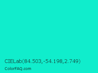 CIELab 84.503,-54.198,2.749 Color is a normal cyan color and the nearest color is Bright Turquoise #08e8de. Hex code #10edcc and RGB value is rgb(16,237,204). In RGB color space, this color is composed of 6% red, 93% green, 80% blue, In CMYK color space, this color is composed of 93% cyan, 0% magenta, 14% yellow , 7% black , In HSL color space, this color has a hue angle of 171° , 87% saturation and 50% lightness.