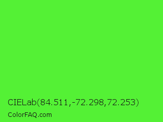 CIELab 84.511,-72.298,72.253 Color is a normal green color and the nearest color is Neon Green #39ff14. Hex code #54f135 and RGB value is rgb(84,241,53). In RGB color space, this color is composed of 33% red, 95% green, 21% blue, In CMYK color space, this color is composed of 65% cyan, 0% magenta, 78% yellow , 5% black , In HSL color space, this color has a hue angle of 110° , 87% saturation and 58% lightness.