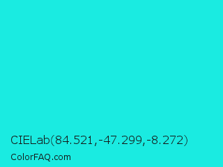 CIELab 84.521,-47.299,-8.272 Color is a normal cyan color and the nearest color is Bright Turquoise #08e8de. Hex code #1aebe1 and RGB value is rgb(26,235,225). In RGB color space, this color is composed of 10% red, 92% green, 88% blue, In CMYK color space, this color is composed of 89% cyan, 0% magenta, 4% yellow , 8% black , In HSL color space, this color has a hue angle of 177° , 84% saturation and 51% lightness.
