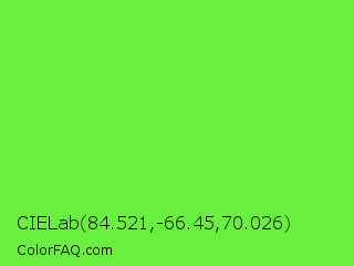CIELab 84.521,-66.45,70.026 Color is a normal green color and the nearest color is Kiwi #8ee53f. Hex code #69ef3d and RGB value is rgb(105,239,61). In RGB color space, this color is composed of 41% red, 94% green, 24% blue, In CMYK color space, this color is composed of 56% cyan, 0% magenta, 74% yellow , 6% black , In HSL color space, this color has a hue angle of 105° , 85% saturation and 59% lightness.