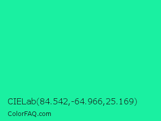 CIELab 84.542,-64.966,25.169 Color is a normal green color and the nearest color is Medium Spring Green #00fa9a. Hex code #1af0a1 and RGB value is rgb(26,240,161). In RGB color space, this color is composed of 10% red, 94% green, 63% blue, In CMYK color space, this color is composed of 89% cyan, 0% magenta, 33% yellow , 6% black , In HSL color space, this color has a hue angle of 158° , 88% saturation and 52% lightness.