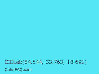 CIELab 84.544,-33.763,-18.691 Color is a light cyan color and the nearest color is Turquoise Blue #6cdae7. Hex code #55e6f5 and RGB value is rgb(85,230,245). In RGB color space, this color is composed of 33% red, 90% green, 96% blue, In CMYK color space, this color is composed of 65% cyan, 6% magenta, 0% yellow , 4% black , In HSL color space, this color has a hue angle of 186° , 89% saturation and 65% lightness.