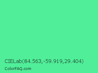 CIELab 84.563,-59.919,29.404 Color is a light green color and the nearest color is Very Light Malachite Green #64e986. Hex code #50ee99 and RGB value is rgb(80,238,153). In RGB color space, this color is composed of 31% red, 93% green, 60% blue, In CMYK color space, this color is composed of 66% cyan, 0% magenta, 36% yellow , 7% black , In HSL color space, this color has a hue angle of 148° , 82% saturation and 62% lightness.