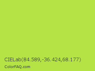 CIELab 84.589,-36.424,68.177 Color is a normal lime color and the nearest color is Conifer #acdd4d. Hex code #b5e346 and RGB value is rgb(181,227,70). In RGB color space, this color is composed of 71% red, 89% green, 27% blue, In CMYK color space, this color is composed of 20% cyan, 0% magenta, 69% yellow , 11% black , In HSL color space, this color has a hue angle of 78° , 74% saturation and 58% lightness.
