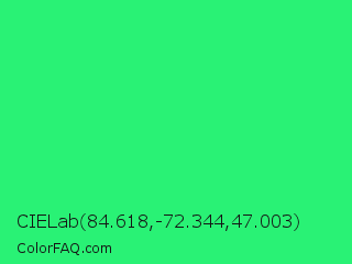 CIELab 84.618,-72.344,47.003 Color is a normal green color and the nearest color is UFO Green #3cd070. Hex code #29f275 and RGB value is rgb(41,242,117). In RGB color space, this color is composed of 16% red, 95% green, 46% blue, In CMYK color space, this color is composed of 83% cyan, 0% magenta, 52% yellow , 5% black , In HSL color space, this color has a hue angle of 143° , 89% saturation and 55% lightness.