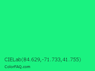 CIELab 84.629,-71.733,41.755 Color is a normal green color and the nearest color is Spring Green #00ff7f. Hex code #1af280 and RGB value is rgb(26,242,128). In RGB color space, this color is composed of 10% red, 95% green, 50% blue, In CMYK color space, this color is composed of 89% cyan, 0% magenta, 47% yellow , 5% black , In HSL color space, this color has a hue angle of 148° , 89% saturation and 53% lightness.
