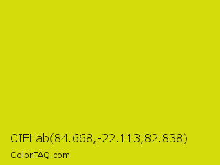 CIELab 84.668,-22.113,82.838 Color is a normal yellow color and the nearest color is Bitter Lemon #cae00d. Hex code #d5dc0c and RGB value is rgb(213,220,12). In RGB color space, this color is composed of 84% red, 86% green, 5% blue, In CMYK color space, this color is composed of 3% cyan, 0% magenta, 95% yellow , 14% black , In HSL color space, this color has a hue angle of 62° , 90% saturation and 45% lightness.