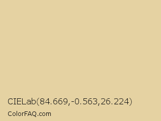 CIELab 84.669,-0.563,26.224 Color is a light orange color and the nearest color is Sapling #ded4a4. Hex code #e5d2a2 and RGB value is rgb(229,210,162). In RGB color space, this color is composed of 90% red, 82% green, 64% blue, In CMYK color space, this color is composed of 0% cyan, 8% magenta, 29% yellow , 10% black , In HSL color space, this color has a hue angle of 43° , 56% saturation and 77% lightness.