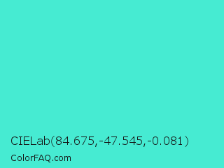 CIELab 84.675,-47.545,-0.081 Color is a normal cyan color and the nearest color is Turquoise #40e0d0. Hex code #46ebd2 and RGB value is rgb(70,235,210). In RGB color space, this color is composed of 27% red, 92% green, 82% blue, In CMYK color space, this color is composed of 70% cyan, 0% magenta, 11% yellow , 8% black , In HSL color space, this color has a hue angle of 171° , 80% saturation and 60% lightness.
