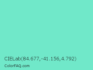 CIELab 84.677,-41.156,4.792 Color is a light cyan color and the nearest color is Bermuda #7dd8c6. Hex code #70e8c9 and RGB value is rgb(112,232,201). In RGB color space, this color is composed of 44% red, 91% green, 79% blue, In CMYK color space, this color is composed of 52% cyan, 0% magenta, 13% yellow , 9% black , In HSL color space, this color has a hue angle of 165° , 72% saturation and 67% lightness.