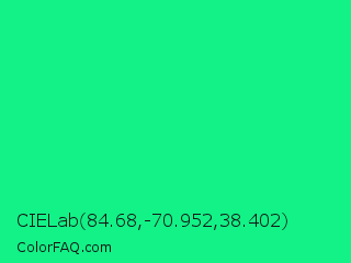 CIELab 84.68,-70.952,38.402 Color is a normal green color and the nearest color is Spring Green #00ff7f. Hex code #12f287 and RGB value is rgb(18,242,135). In RGB color space, this color is composed of 7% red, 95% green, 53% blue, In CMYK color space, this color is composed of 93% cyan, 0% magenta, 44% yellow , 5% black , In HSL color space, this color has a hue angle of 151° , 90% saturation and 51% lightness.