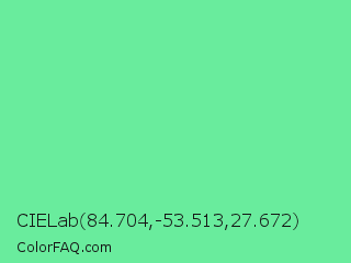 CIELab 84.704,-53.513,27.672 Color is a light green color and the nearest color is Medium Aquamarine #66ddaa. Hex code #69ec9d and RGB value is rgb(105,236,157). In RGB color space, this color is composed of 41% red, 93% green, 62% blue, In CMYK color space, this color is composed of 56% cyan, 0% magenta, 33% yellow , 7% black , In HSL color space, this color has a hue angle of 144° , 78% saturation and 67% lightness.