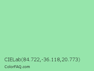 CIELab 84.722,-36.118,20.773 Color is a light green color and the nearest color is Teal Deer #99e6b3. Hex code #96e5ab and RGB value is rgb(150,229,171). In RGB color space, this color is composed of 59% red, 90% green, 67% blue, In CMYK color space, this color is composed of 34% cyan, 0% magenta, 25% yellow , 10% black , In HSL color space, this color has a hue angle of 136° , 60% saturation and 74% lightness.