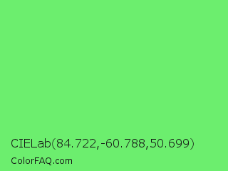 CIELab 84.722,-60.788,50.699 Color is a light green color and the nearest color is Screamin Green #66ff66. Hex code #6cee6e and RGB value is rgb(108,238,110). In RGB color space, this color is composed of 42% red, 93% green, 43% blue, In CMYK color space, this color is composed of 55% cyan, 0% magenta, 54% yellow , 7% black , In HSL color space, this color has a hue angle of 121° , 79% saturation and 68% lightness.