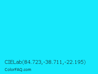 CIELab 84.723,-38.711,-22.195 Color is a normal cyan color and the nearest color is Loeen #15f2fd. Hex code #15e9fc and RGB value is rgb(21,233,252). In RGB color space, this color is composed of 8% red, 91% green, 99% blue, In CMYK color space, this color is composed of 92% cyan, 8% magenta, 0% yellow , 1% black , In HSL color space, this color has a hue angle of 185° , 97% saturation and 54% lightness.