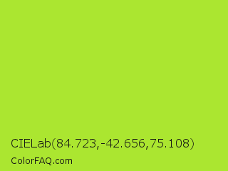 CIELab 84.723,-42.656,75.108 Color is a normal lime color and the nearest color is Green Lizard #a7f432. Hex code #abe630 and RGB value is rgb(171,230,48). In RGB color space, this color is composed of 67% red, 90% green, 19% blue, In CMYK color space, this color is composed of 26% cyan, 0% magenta, 79% yellow , 10% black , In HSL color space, this color has a hue angle of 79° , 78% saturation and 55% lightness.