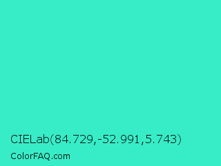 CIELab 84.729,-52.991,5.743 Color is a normal cyan color and the nearest color is Turquoise #40e0d0. Hex code #36edc7 and RGB value is rgb(54,237,199). In RGB color space, this color is composed of 21% red, 93% green, 78% blue, In CMYK color space, this color is composed of 77% cyan, 0% magenta, 16% yellow , 7% black , In HSL color space, this color has a hue angle of 168° , 84% saturation and 57% lightness.
