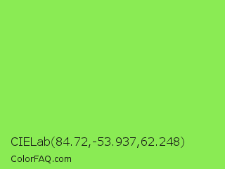 CIELab 84.72,-53.937,62.248 Color is a light green color and the nearest color is Kiwi #8ee53f. Hex code #8aeb54 and RGB value is rgb(138,235,84). In RGB color space, this color is composed of 54% red, 92% green, 33% blue, In CMYK color space, this color is composed of 41% cyan, 0% magenta, 64% yellow , 8% black , In HSL color space, this color has a hue angle of 99° , 79% saturation and 63% lightness.