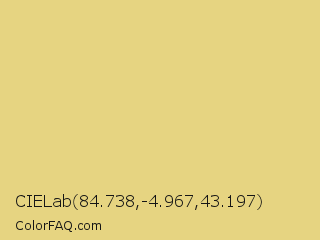 CIELab 84.738,-4.967,43.197 Color is a light yellow color and the nearest color is Flax #eedc82. Hex code #e6d481 and RGB value is rgb(230,212,129). In RGB color space, this color is composed of 90% red, 83% green, 51% blue, In CMYK color space, this color is composed of 0% cyan, 8% magenta, 44% yellow , 10% black , In HSL color space, this color has a hue angle of 49° , 67% saturation and 70% lightness.
