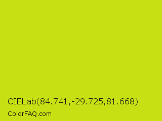 CIELab 84.741,-29.725,81.668 Color is a normal yellow color and the nearest color is Bitter Lemon #cae00d. Hex code #c7e013 and RGB value is rgb(199,224,19). In RGB color space, this color is composed of 78% red, 88% green, 7% blue, In CMYK color space, this color is composed of 11% cyan, 0% magenta, 92% yellow , 12% black , In HSL color space, this color has a hue angle of 67° , 84% saturation and 48% lightness.