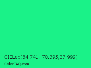 CIELab 84.741,-70.395,37.999 Color is a normal green color and the nearest color is Spring Green #00ff7f. Hex code #1af288 and RGB value is rgb(26,242,136). In RGB color space, this color is composed of 10% red, 95% green, 53% blue, In CMYK color space, this color is composed of 89% cyan, 0% magenta, 44% yellow , 5% black , In HSL color space, this color has a hue angle of 151° , 89% saturation and 53% lightness.