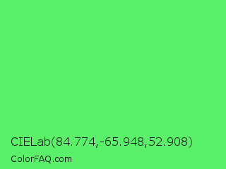 CIELab 84.774,-65.948,52.908 Color is a light green color and the nearest color is Screamin Green #66ff66. Hex code #5bf069 and RGB value is rgb(91,240,105). In RGB color space, this color is composed of 36% red, 94% green, 41% blue, In CMYK color space, this color is composed of 62% cyan, 0% magenta, 56% yellow , 6% black , In HSL color space, this color has a hue angle of 126° , 83% saturation and 65% lightness.