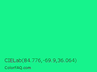 CIELab 84.776,-69.9,36.064 Color is a normal green color and the nearest color is Medium Spring Green #00fa9a. Hex code #16f28c and RGB value is rgb(22,242,140). In RGB color space, this color is composed of 9% red, 95% green, 55% blue, In CMYK color space, this color is composed of 91% cyan, 0% magenta, 42% yellow , 5% black , In HSL color space, this color has a hue angle of 152° , 89% saturation and 52% lightness.