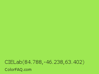 CIELab 84.788,-46.238,63.402 Color is a light green color and the nearest color is Conifer #acdd4d. Hex code #9ee852 and RGB value is rgb(158,232,82). In RGB color space, this color is composed of 62% red, 91% green, 32% blue, In CMYK color space, this color is composed of 32% cyan, 0% magenta, 65% yellow , 9% black , In HSL color space, this color has a hue angle of 90° , 77% saturation and 62% lightness.