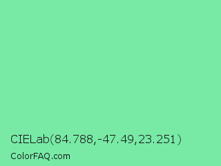 CIELab 84.788,-47.49,23.251 Color is a light green color and the nearest color is Medium Aquamarine #66ddaa. Hex code #78eaa6 and RGB value is rgb(120,234,166). In RGB color space, this color is composed of 47% red, 92% green, 65% blue, In CMYK color space, this color is composed of 49% cyan, 0% magenta, 29% yellow , 8% black , In HSL color space, this color has a hue angle of 144° , 73% saturation and 69% lightness.