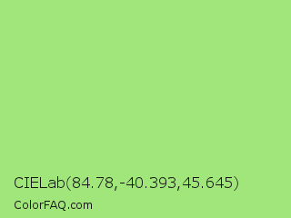 CIELab 84.78,-40.393,45.645 Color is a light green color and the nearest color is Feijoa #9fdd8c. Hex code #a1e67a and RGB value is rgb(161,230,122). In RGB color space, this color is composed of 63% red, 90% green, 48% blue, In CMYK color space, this color is composed of 30% cyan, 0% magenta, 47% yellow , 10% black , In HSL color space, this color has a hue angle of 98° , 68% saturation and 69% lightness.
