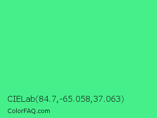 CIELab 84.7,-65.058,37.063 Color is a light green color and the nearest color is Very Light Malachite Green #64e986. Hex code #45f08a and RGB value is rgb(69,240,138). In RGB color space, this color is composed of 27% red, 94% green, 54% blue, In CMYK color space, this color is composed of 71% cyan, 0% magenta, 43% yellow , 6% black , In HSL color space, this color has a hue angle of 144° , 85% saturation and 61% lightness.