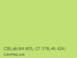 CIELab 84.805,-27.578,49.426 Color is a light lime color and the nearest color is Yellow Green #c5e17a. Hex code #bfe073 and RGB value is rgb(191,224,115). In RGB color space, this color is composed of 75% red, 88% green, 45% blue, In CMYK color space, this color is composed of 15% cyan, 0% magenta, 49% yellow , 12% black , In HSL color space, this color has a hue angle of 78° , 64% saturation and 66% lightness.