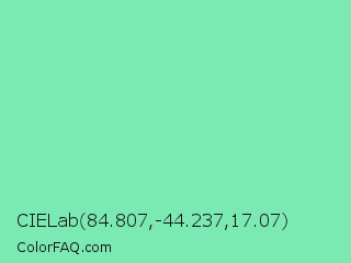 CIELab 84.807,-44.237,17.07 Color is a light green color and the nearest color is Medium Aquamarine #66ddaa. Hex code #7ae9b2 and RGB value is rgb(122,233,178). In RGB color space, this color is composed of 48% red, 91% green, 70% blue, In CMYK color space, this color is composed of 48% cyan, 0% magenta, 24% yellow , 9% black , In HSL color space, this color has a hue angle of 150° , 72% saturation and 70% lightness.